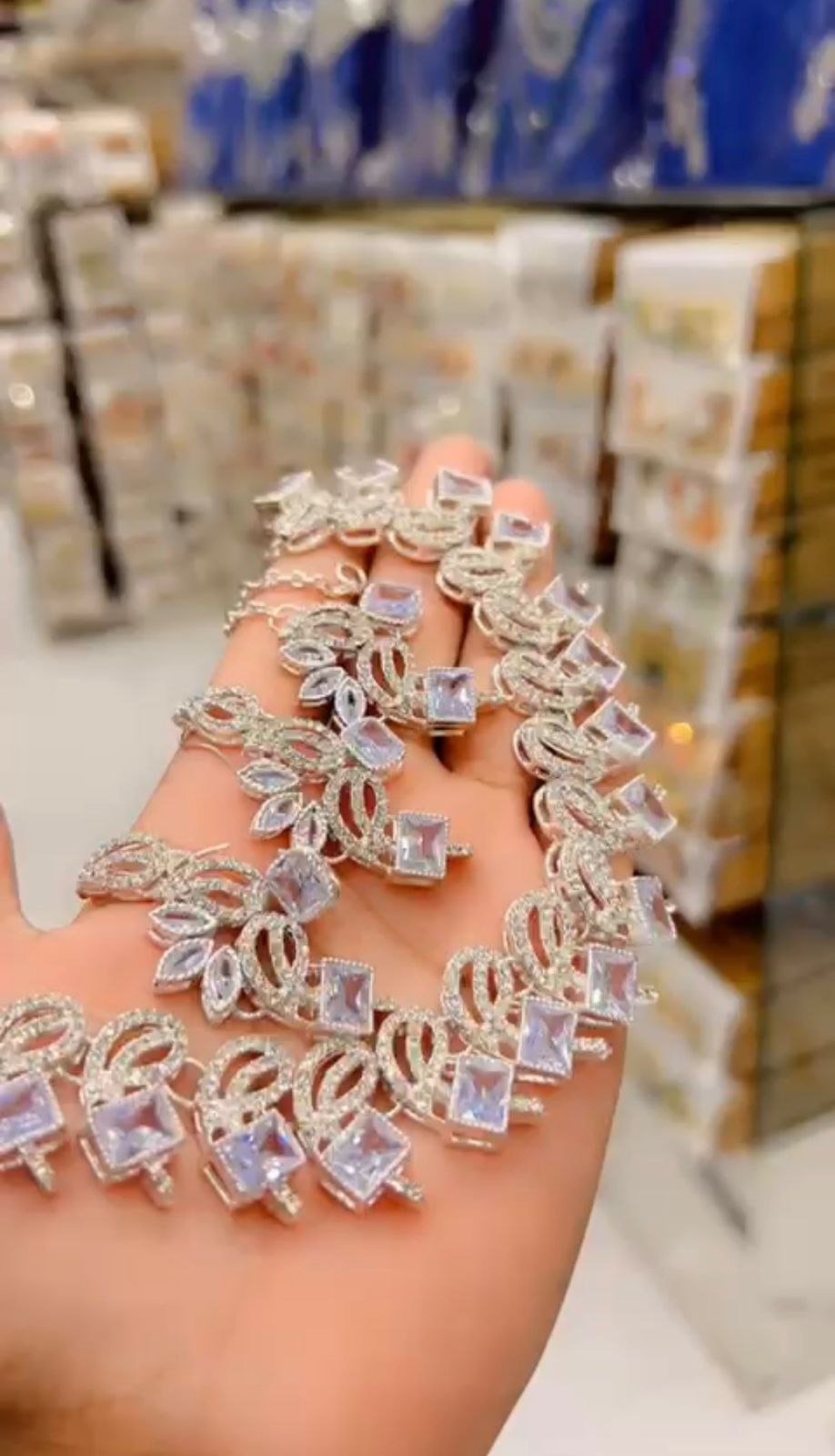 This 3-piece jewellery set includes a stunning necklace, matching earrings, and a delicate matha patti — perfect for Mehndi, Barat, or Walima events.